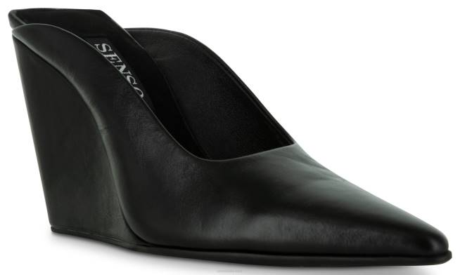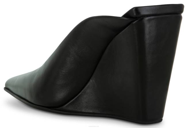 Zapatos mule con tacón en piel de becerro brillante color ébano, con puntera en punta, diseño sin cordones y tacón de cuña.