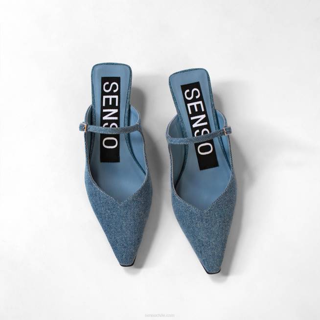 Zapato azul denim, cierre con hebilla lateral, estilo slip-on, puntera en punta y tacón bajo.