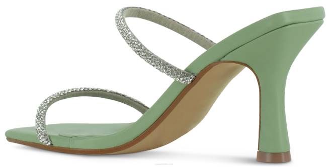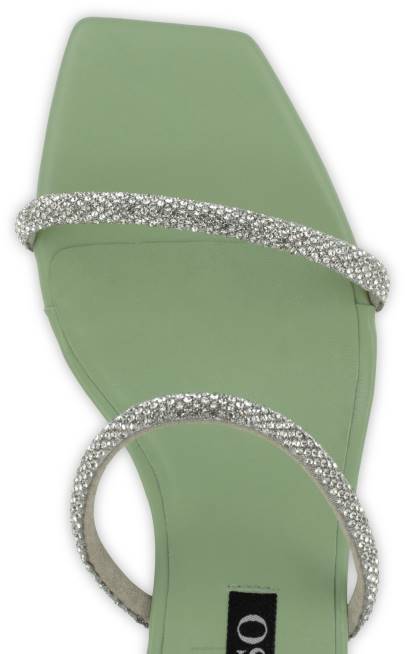 Zapatos de salón en piel de cabritilla mate pistacho con puntera cuadrada abierta y tiras de cristal plateado.
