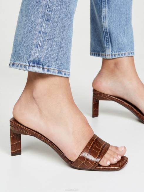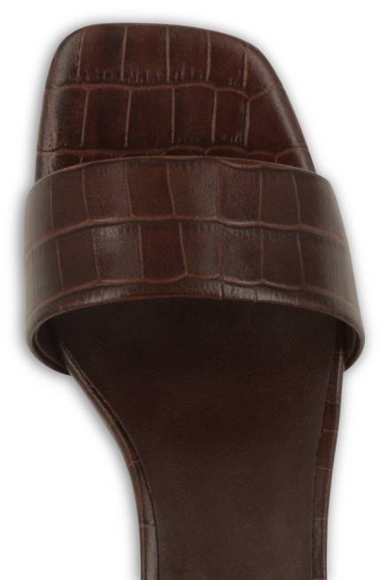 Zapato mule maisy i de piel marrón con puntera abierta, estilo slip-on, efecto cocodrilo en relieve, plantilla con logo y tacón alto.