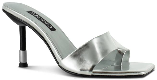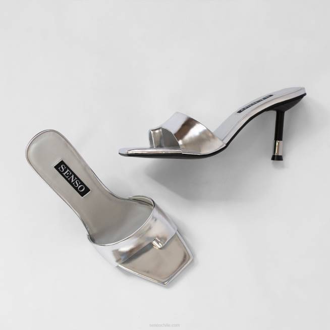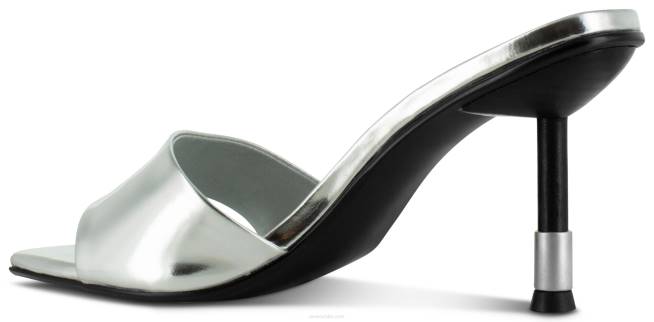 Tacón en cromo plateado, con diseño de punta abierta, talón con detalles de metal y suela de resina.