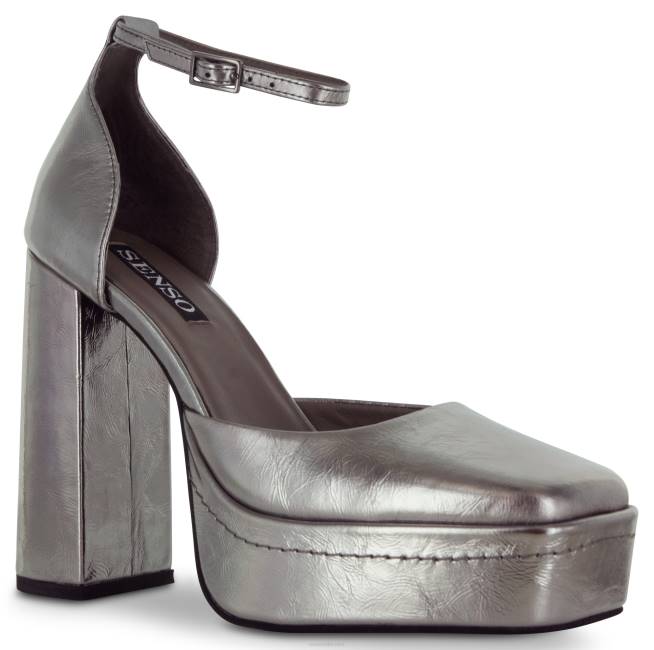Zapatos de tacón con plataforma de naplack de acero cromado, con hebilla de metal, tacón de bloque y plantilla con la marca.