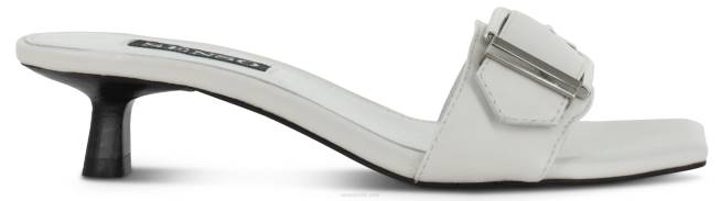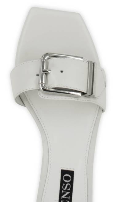 Sandalias de piel de cabrito mate mazapán con hebilla de metal brillante, sutil tacón bajo y puntera cuadrada.
