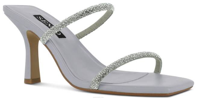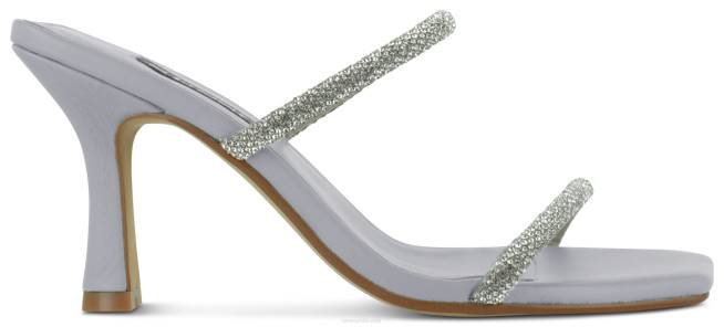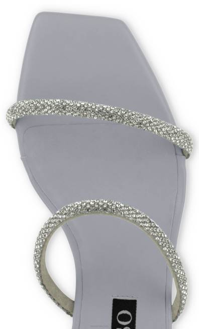 Zapatos de tacón de piel de cabrito color lavanda mate con puntera cuadrada abierta y tiras de cristal plateado.