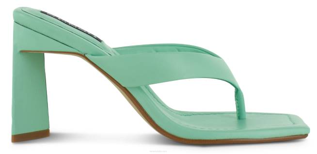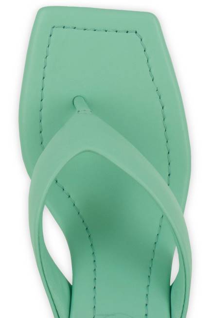 Zapatos de tacón de piel de cabritilla mate verde menta con un diseño sin cordones, detalle de correa de tira y tacón de bloque triangular.