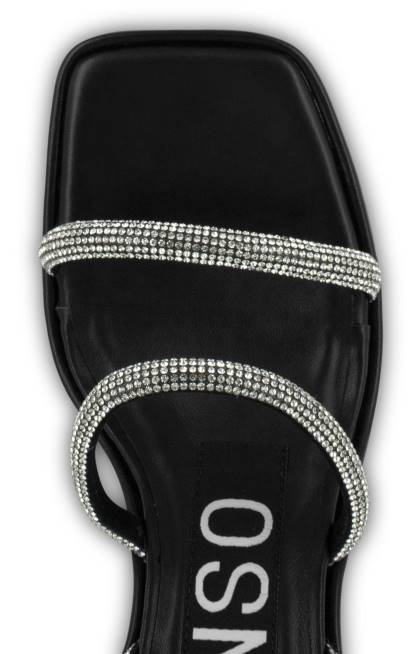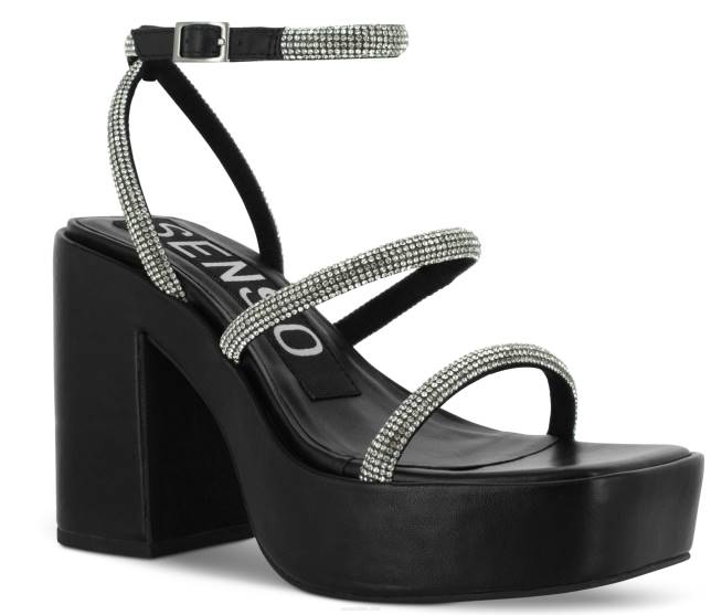 Sandalias con correa de cristal de ébano, con tacón de bloque de plataforma, hebilla de metal y puntera cuadrada.
