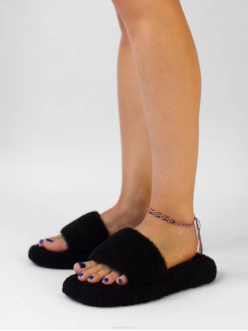Sandalias de piel de oveja sintética de ébano con un diseño suave y esponjoso y suela de goma.