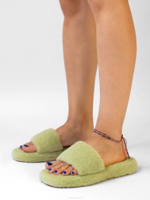 Sandalias de piel de oveja sintética color pistacho, con un diseño sin cierres esponjoso y suela de goma ligera.