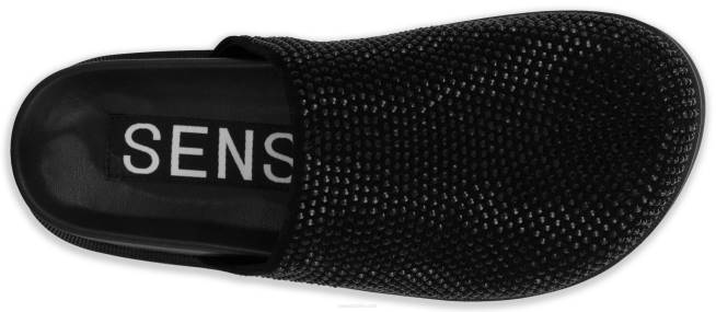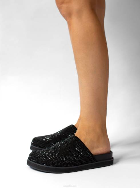 Zapato mule en antelina ebony y cristales, con diseño de strass, puntera cerrada y suela de goma.