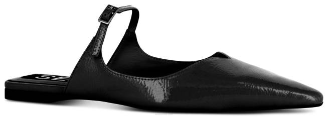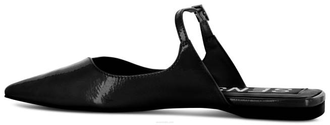 Bailarinas / chinelas de piel de naplak color ébano con estilo sin cordones, puntera en punta, cierre de hebilla, herrajes plateados, plantilla de piel con la marca y suela plana de goma.